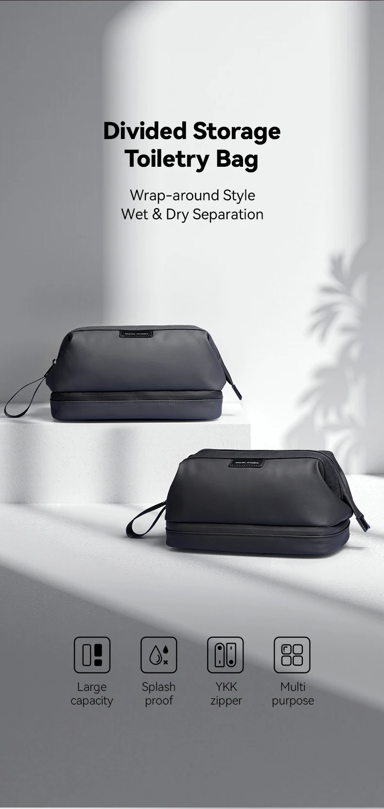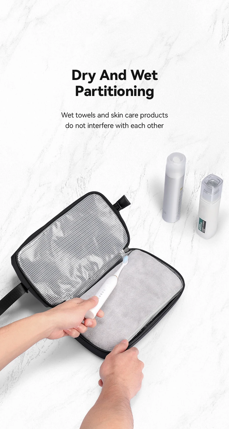 Dank der speziellen Fächertrennung bleiben nasse und trockene Gegenstände stets voneinander getrennt. So bleibt der Inhalt sauber, hygienisch und gut organisiert.